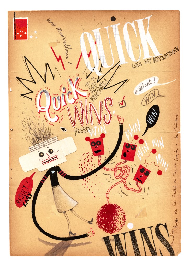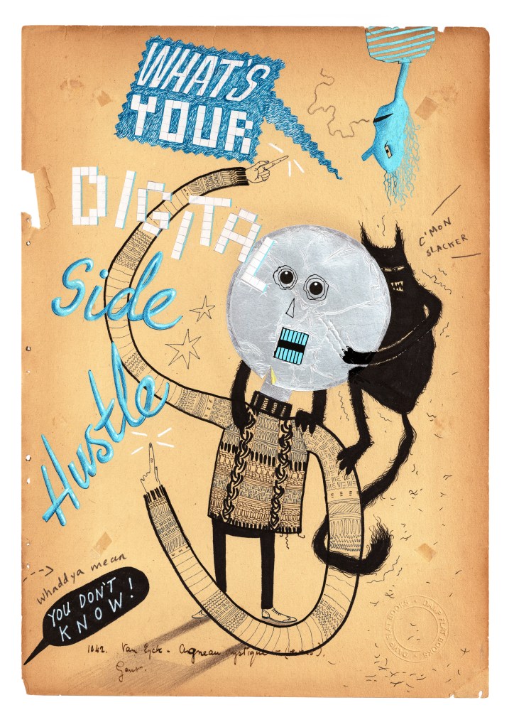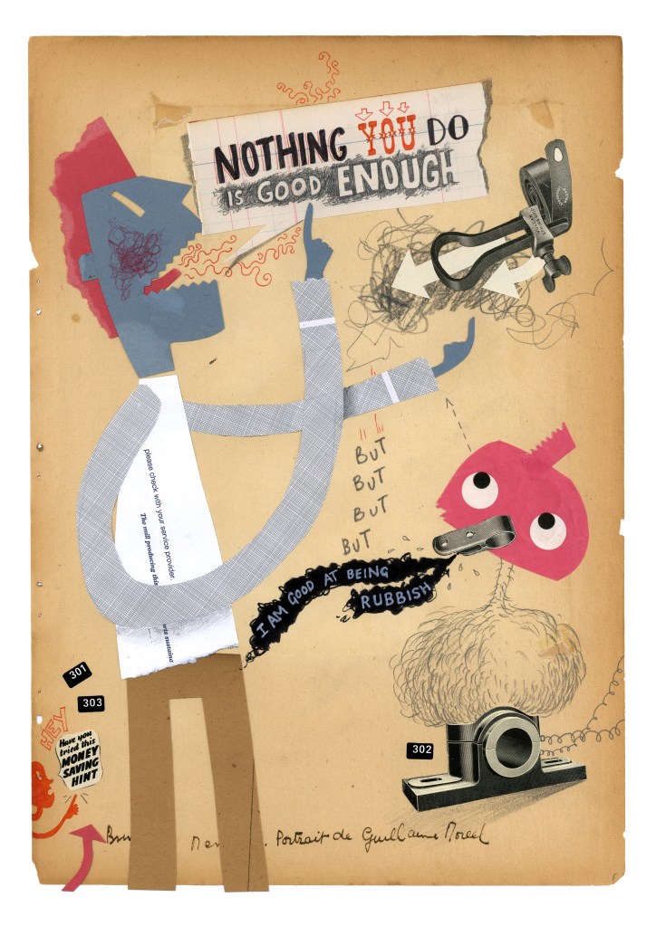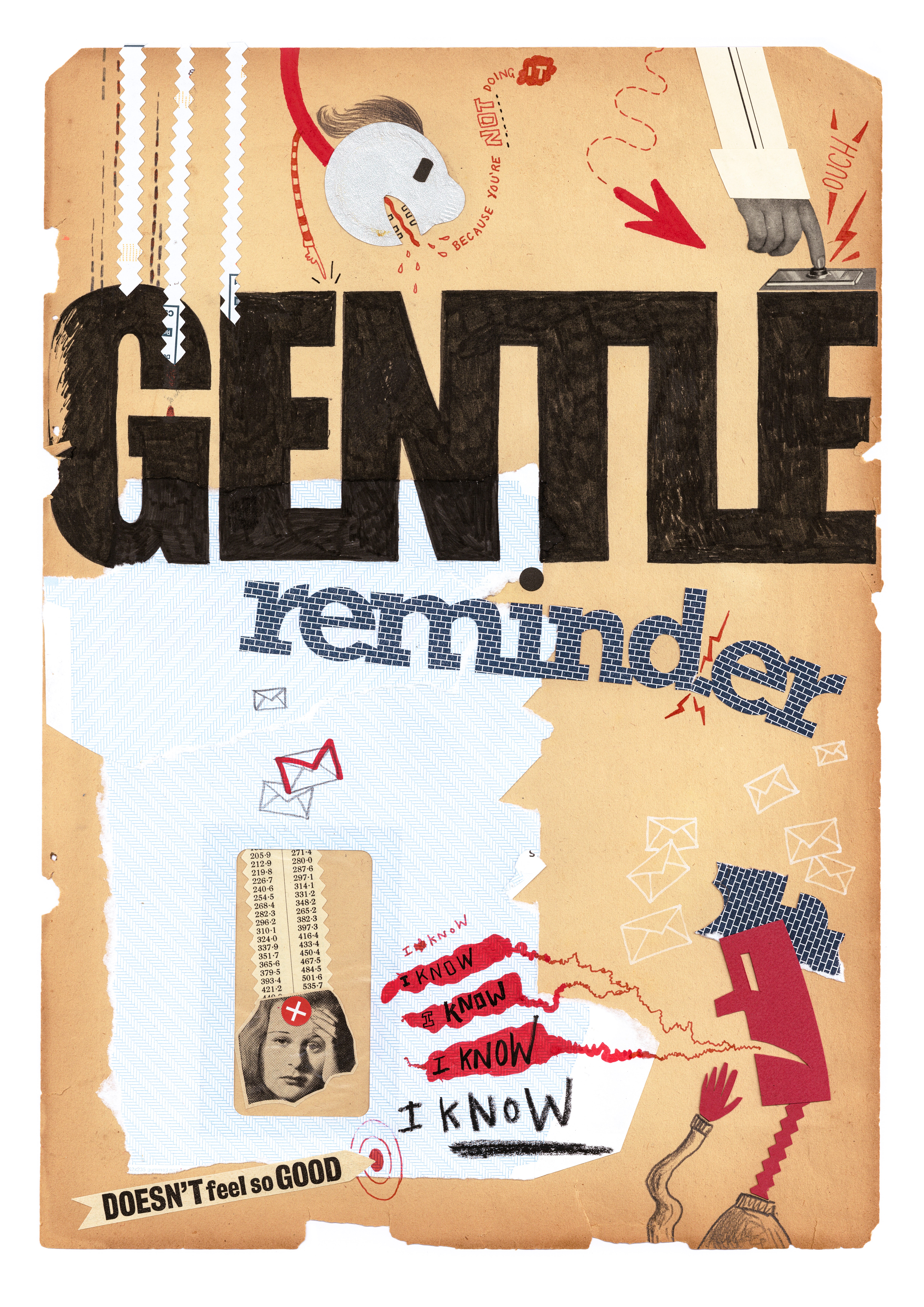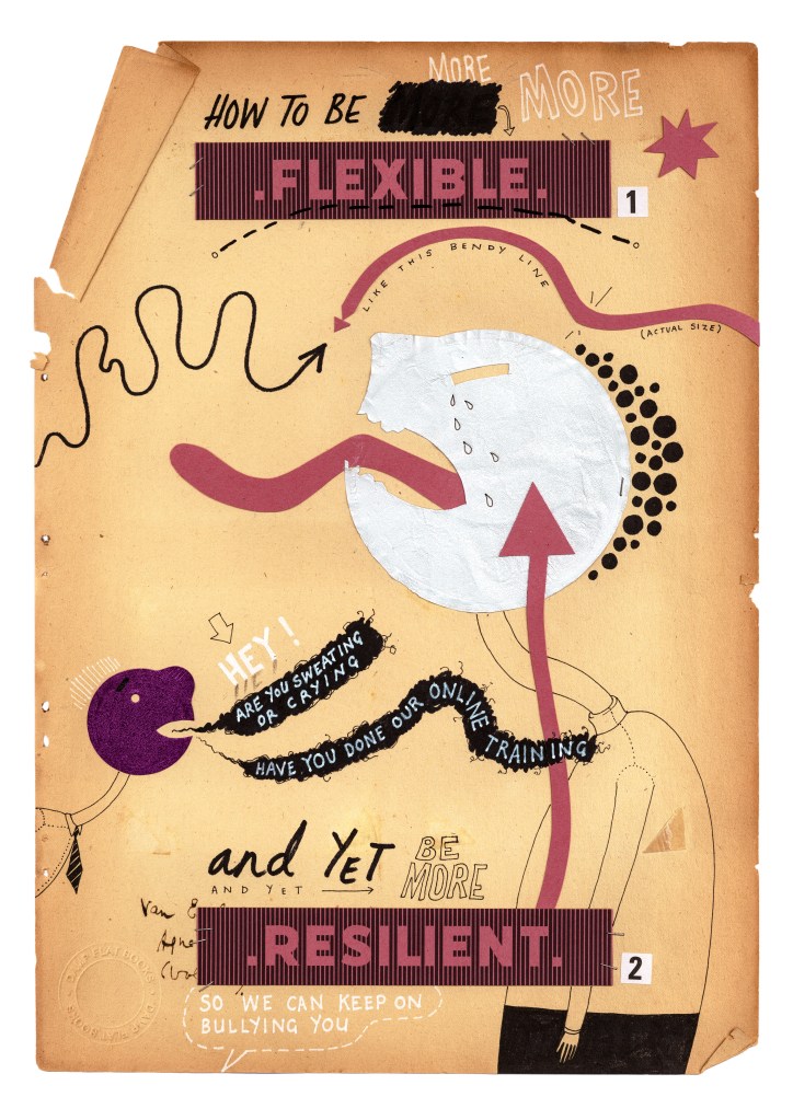 This series explores the impact of language on mental health. Created through a combination of collage and drawing techniques, they bring attention to the passive-aggressive phrases and words that are often used to bully and blame individuals. The works feature a clash of cartoon-like imagery and hand-drawn text, highlighting phrases such as “being resilient” and “gentle reminder” that can be used in a harmful manner. Similarly, as technology rapidly evolves, so too does the absurdity of the language we use to describe it. This language is parodied to highlight how it can make us as humans feel anxious, out-of-date or redundant.
