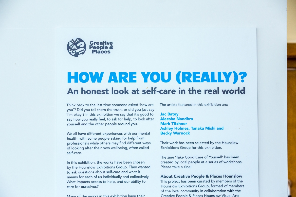 In this exhibition, the works have been chosen by the Hounslow Exhibitions Group. They wanted to ask questions about self-care and what it means for each of us individually and collectively. What are the social conditions that affect us, and our access to help, and our ability to care for ourselves?
