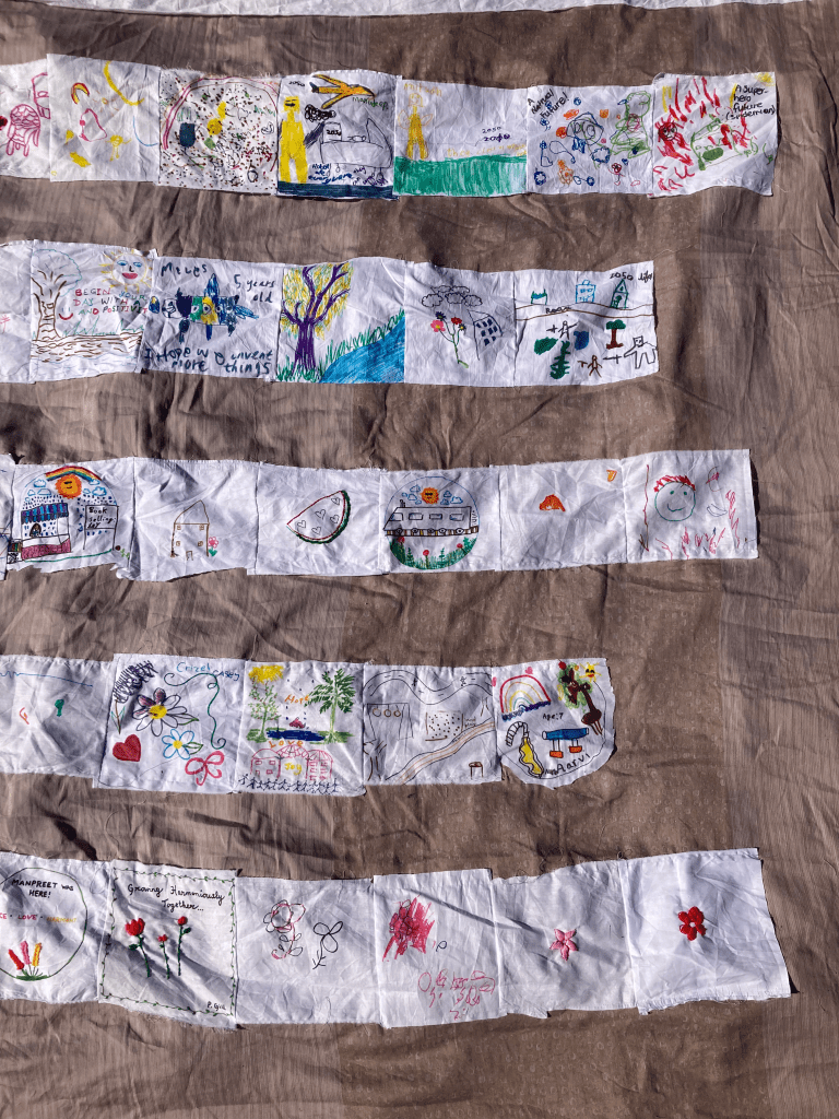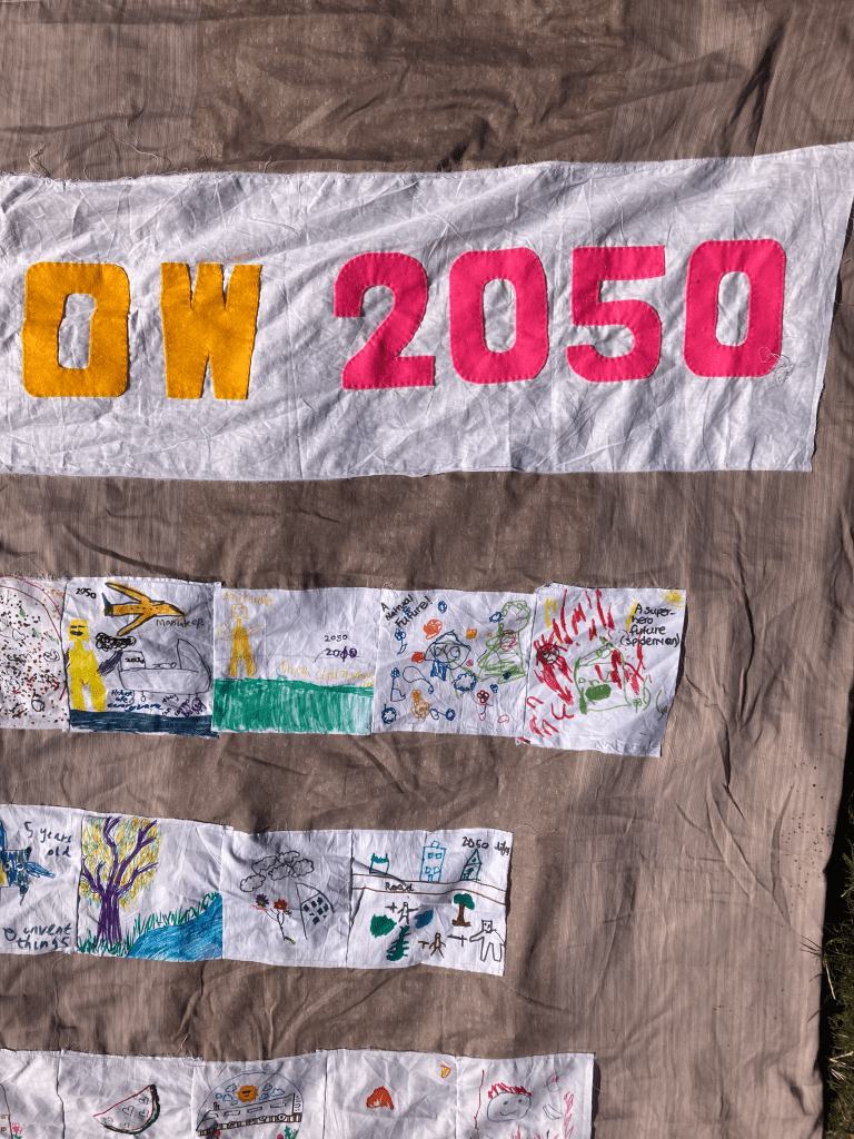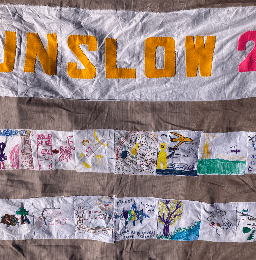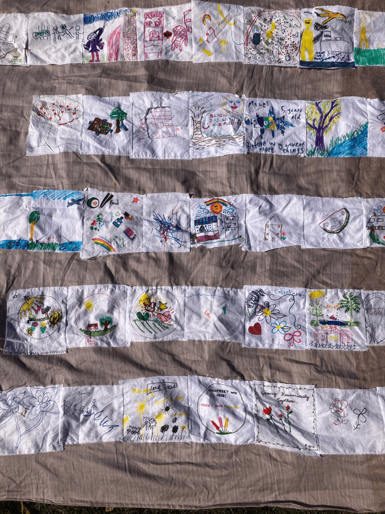 At this community event led by Feltham Local Arts Group, artist Yukiko Munemoto supported participants from a range of ages to share their visions through stitching and drawing on fabric which she brought together into a collaboratively tapestry.
